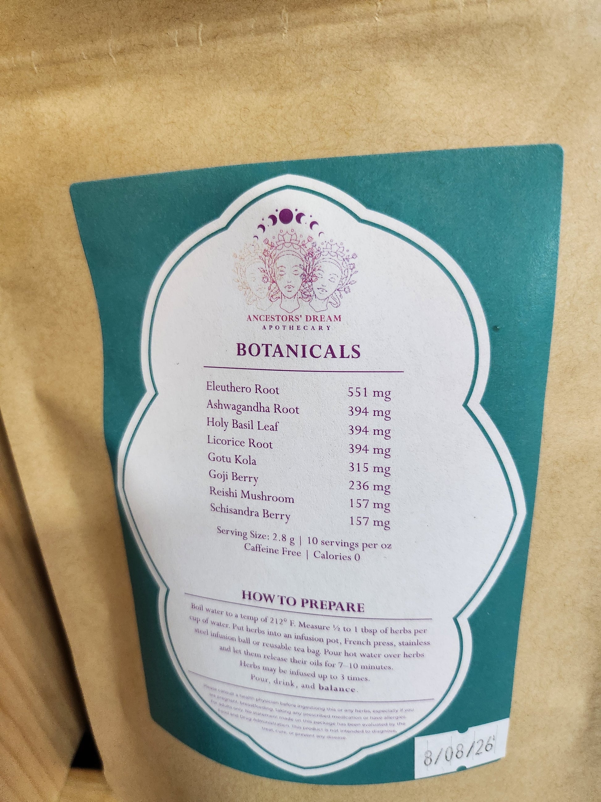 Ashwagandha Root, Eleuthero Root, Goji Berry, Gotu Kola, Holy Basil Leaf, Licorice Root, Reishi Mushroom, Schisandra Berry