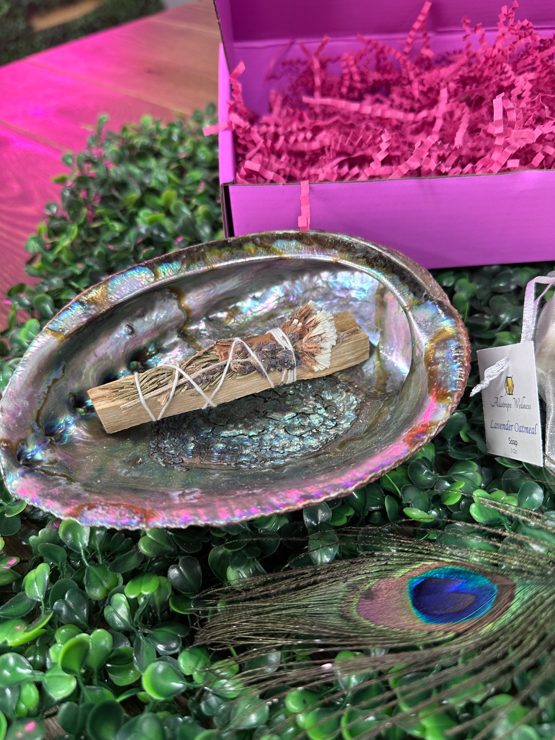 Medium-Sized Abalone Shell: A stunning natural shell to catch ash during smudging rituals. The abalone shell also represents water, balancing the fire of smudging and grounding the practice in the four sacred elements.