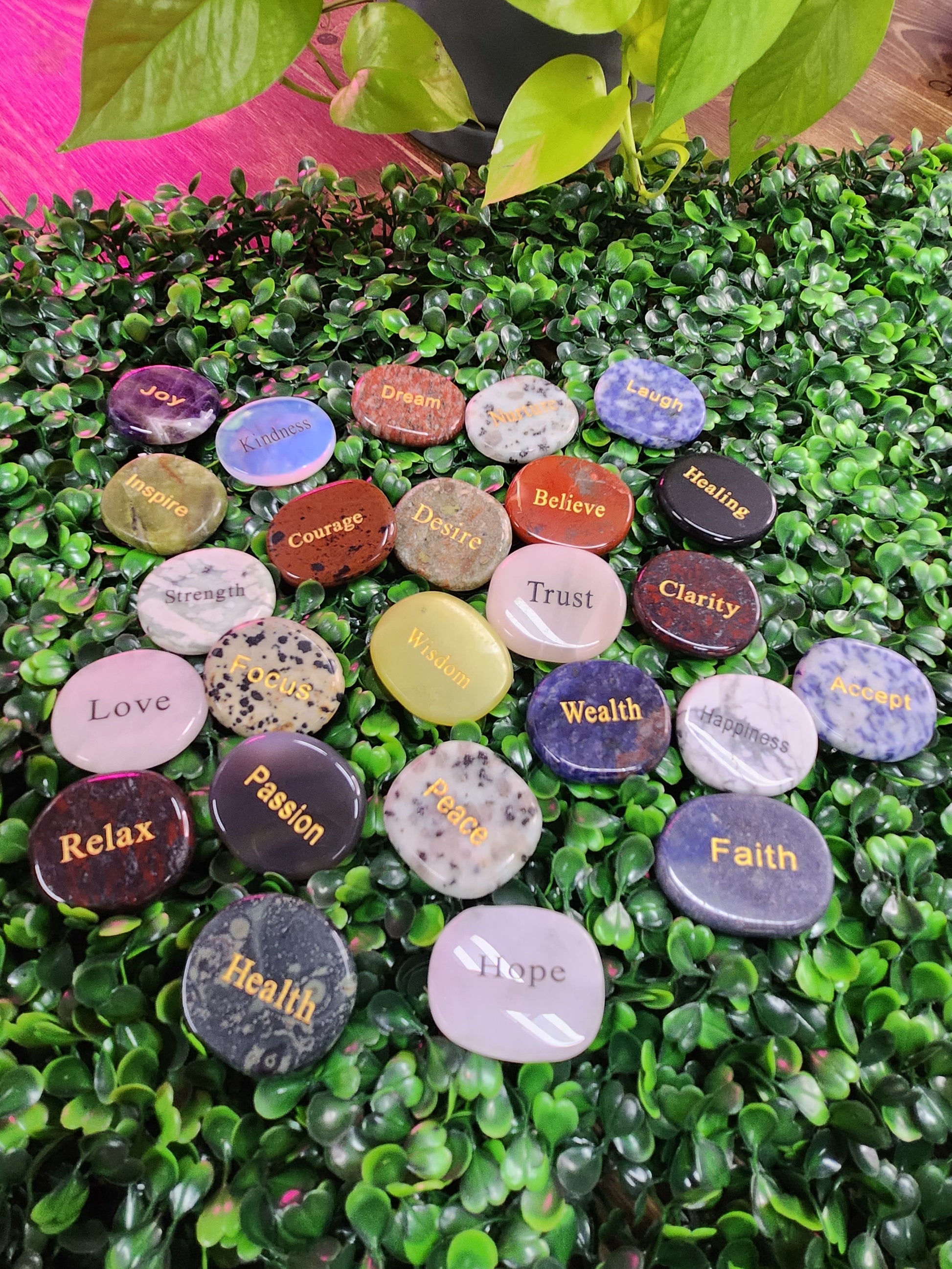 These inspirational wish stones are a great way to carry your energy and your mantra. They are polished and flatted to fit your pocket or purse. All lettering is written either gold or black on the real gemstones. This is a perfect gift for someone who needs that extra boost of motivation in their day