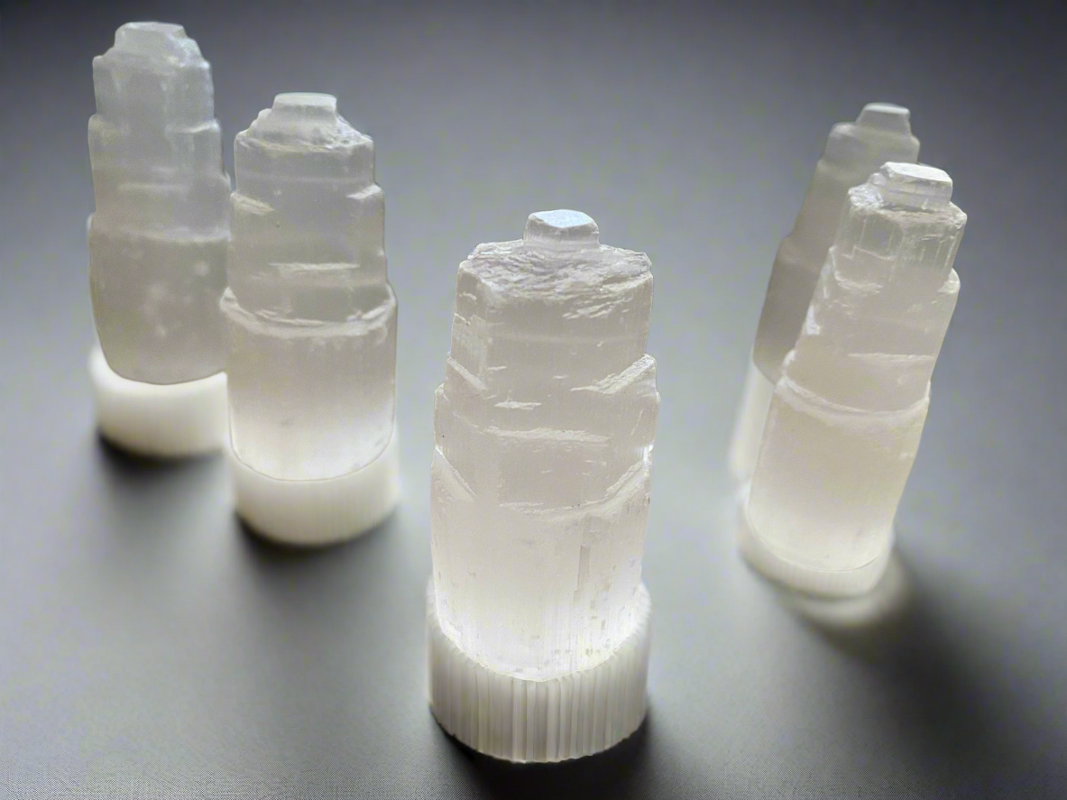 Selenite allows you to access angelic consciousness and higher guidance. It’s a calming stone that gives deep peace. Selenite is excellent for meditation and enhances telepathy. It has the ability to form a protective grid around a sacred space. Towers range from 2”-2.5” inches tall