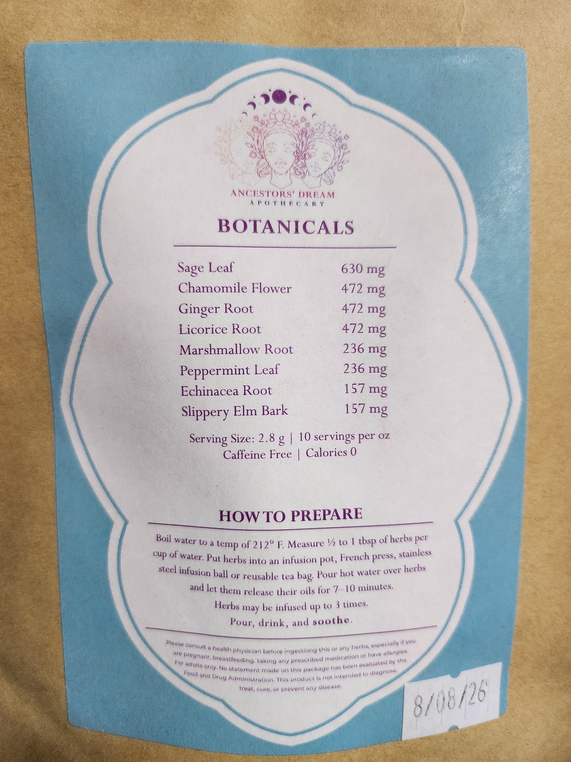 Chamomile Flower, Echinacea Root, Ginger Root, Licorice Root, Marshmallow Root, Peppermint Leaf, Sage Leaf, Slippery Elm Bark